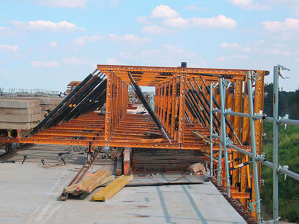 Bednící římsový vozík je lehký a flexibilní bednící systém, používaný pro stavbu ochranných říms mostů nebo řešení s menšími požadavky na zatížení.