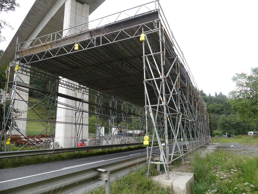 Používané při stavbě nadjezdů, chrání pracovníky během jejich práce a umožňují plynulý provoz dopravy pod ochranným lešením. Ochranná část je složená z lešenových věží, zesilujících příhrad a střešní plošiny.