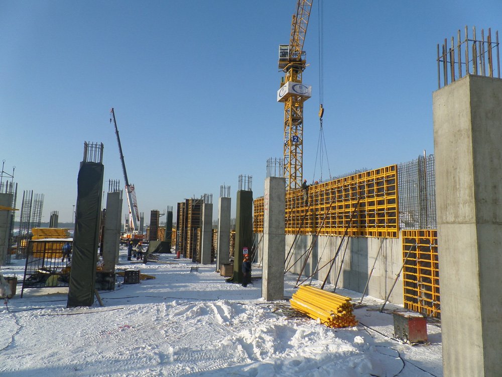 Pro stavbu železobetonových podlahových desek nad podzemními úrovněmi pavilonu C byly betonové práce rozděleny na pracovní plochy o rozloze kolem 600 m2. Struktura podlahové desky se skládá z železobetonové desky o tloušťce 0,30 m, s vaznými trámy o výšce 1,0 m a rozpětí mezi sloupy do 8,5 m. Naše společnost dodala univerzální stěnové bednící panely PRIMO široké 1,2 m. To optimalizovalo pracovní dobu bednění a umožnilo stavbu sloupů bez použití vazných trámů procházejících sloupy.
