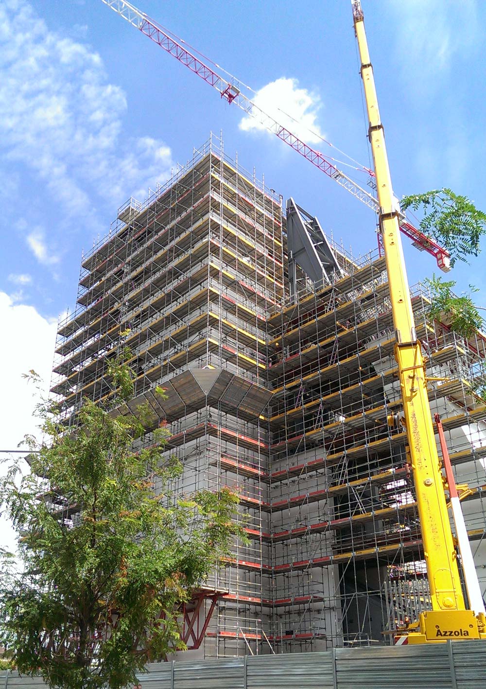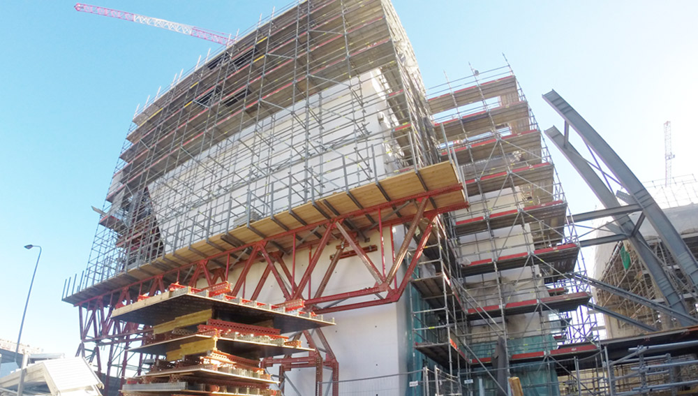 S osmi nosníky MK bylo možno provést betonáž druhého patra z úrovně ulice. Tato struktura také sloužila k podepření přístupového chodníku na severní straně budovy. Konzoly MK nesly bednění a lešení podél celého obvodu a uvolnily tak plochu staveniště pro dokončovací práce.