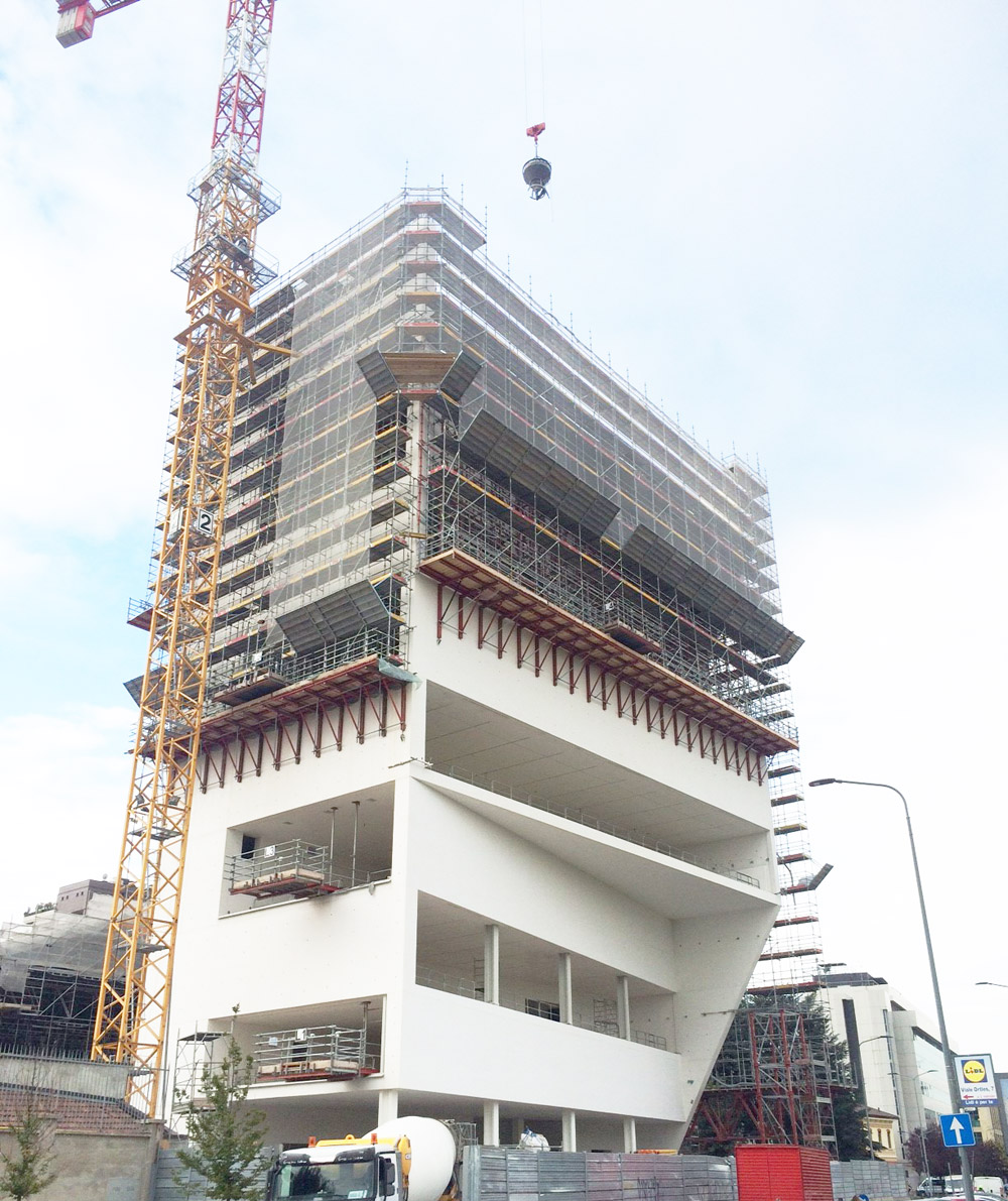 Kreativní řešení bylo nalezeno i pro bednění a podpůrné konstrukce, které se perfektně přizpůsobily požadavkům projektu. K vytvoření tvarů a povrchů dle návrhu architekta bylo využito bednění ENKOFORM VMK – téměř 2.000 m² bylo spotřebováno na stěny a 1.200 m² na stropy. Vytvořili jsme sestavy pro výstavbu dvou podlaží naráz.