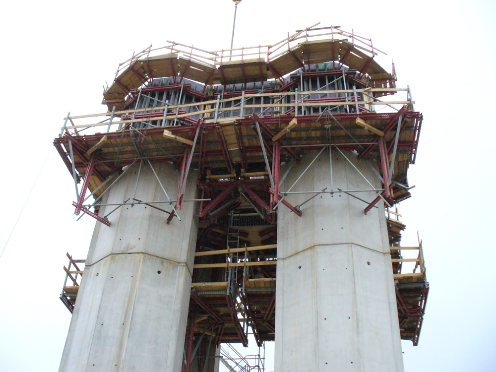 Pilíře, krajní paty mostu a segmenty pilířů byly postaveny s využitím modulárního bednění na bázi systému MK. Pro strukturu, podepírající zpevňující stěnu, byly využity zátěžové konzoly MK a šplhací systém, obojí ve speciální úpravě pro tvar těchto pilířů.