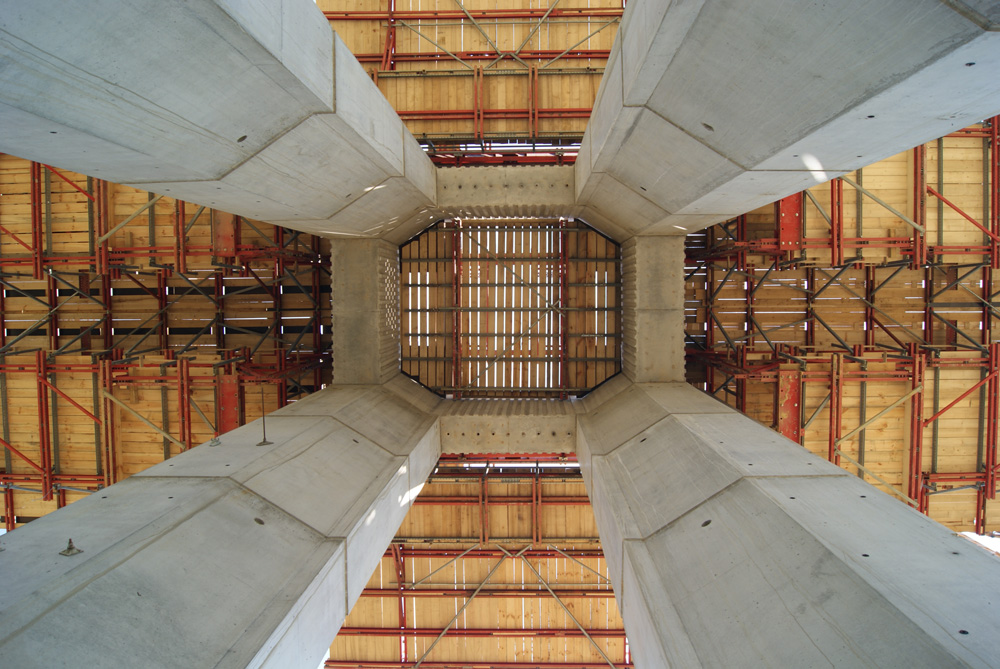 V horní části pilíře byly mezerami mezi podpěrami vsunuty 4 příčné nosníky, které byly postaveny na základovou desku. S touto podpůrnou strukturou byl segment pilíře odlit ve třech taktech mezi vertikálně i horizontálně umístěným bedněním MK.