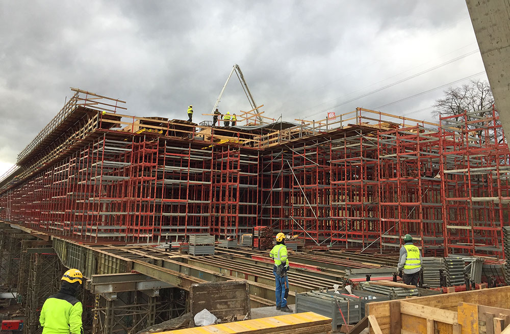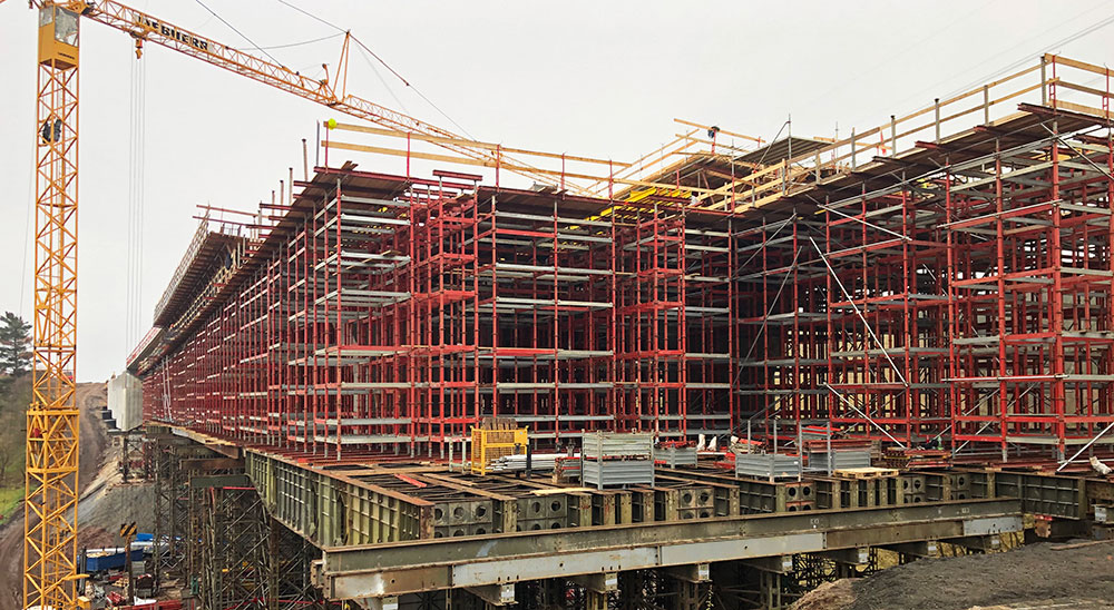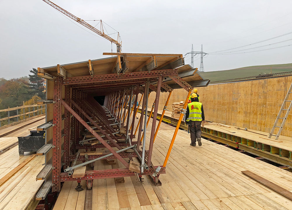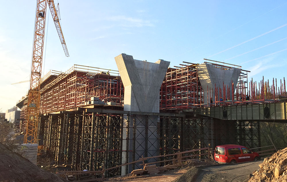 Navrhované řešení je modifikováno a přizpůsobeno nárokům vyplývajícím z tvarových a technologických požadavků uvedené stavby. Z hlediska systémového řešení, byla podpěrná konstrukce zkombinována ze systému Orthoplus a T-60 a starého armádního systému PIŽMO, který náš zákazník vlastní. Jako bednění nosné konstrukce byly použity vozíky Meccano délky 42 m pro jednu etapu.