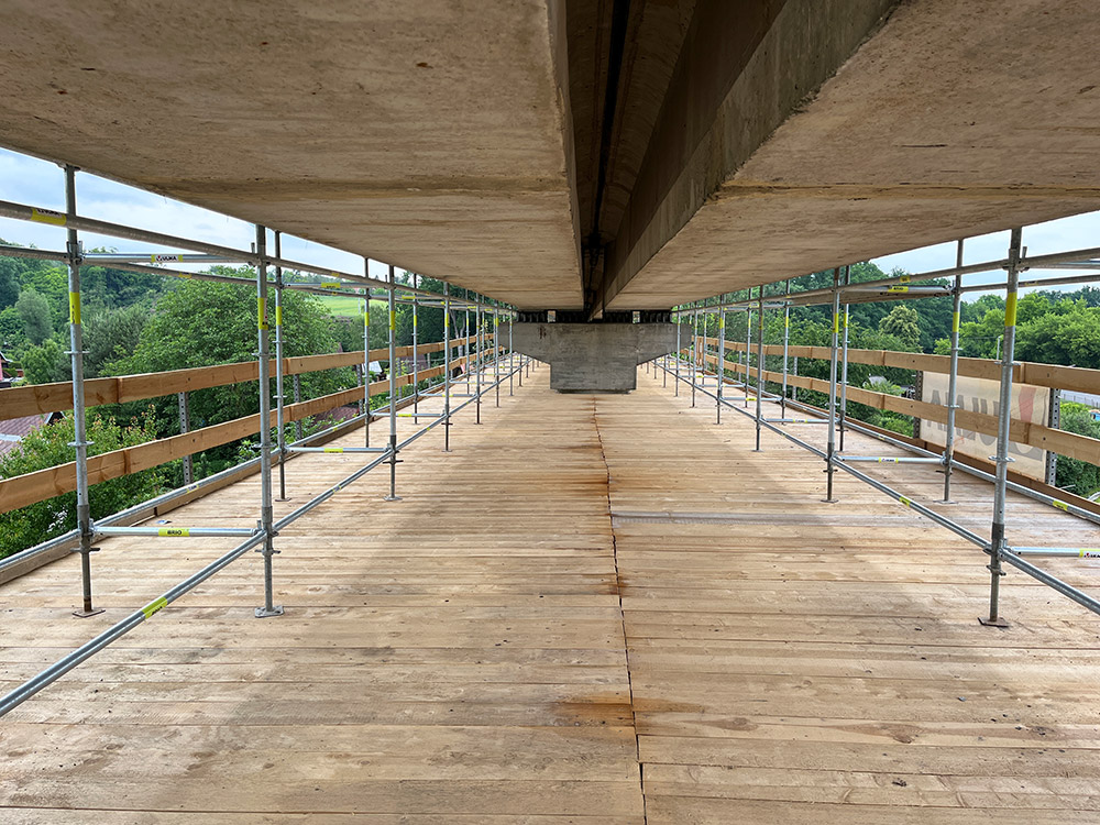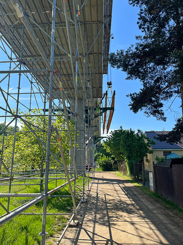 Díky umístění mostu byla zvolena kombinace prostorového lešení BRIO založeného na zemi a lešení zavěšeného na konzolách pomocí nosníků H-33 v polích, kde nebyla možná instalace ze země.