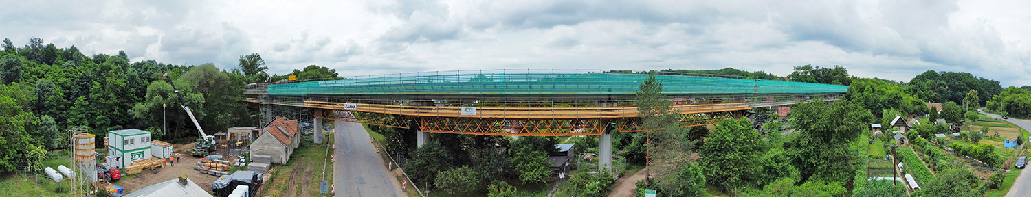 Z důvodu prostorové náročnosti předmontáže nosníků H-33, byla pro tyto práce zvolena pracovní plocha v těsné blízkosti železnice (cca 3 km od stavby).
