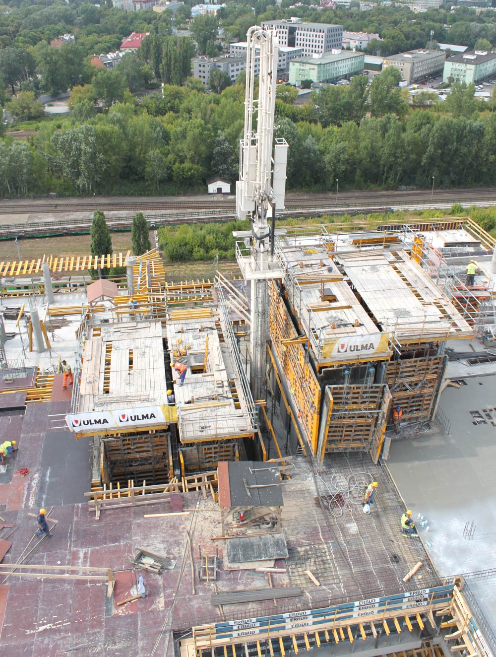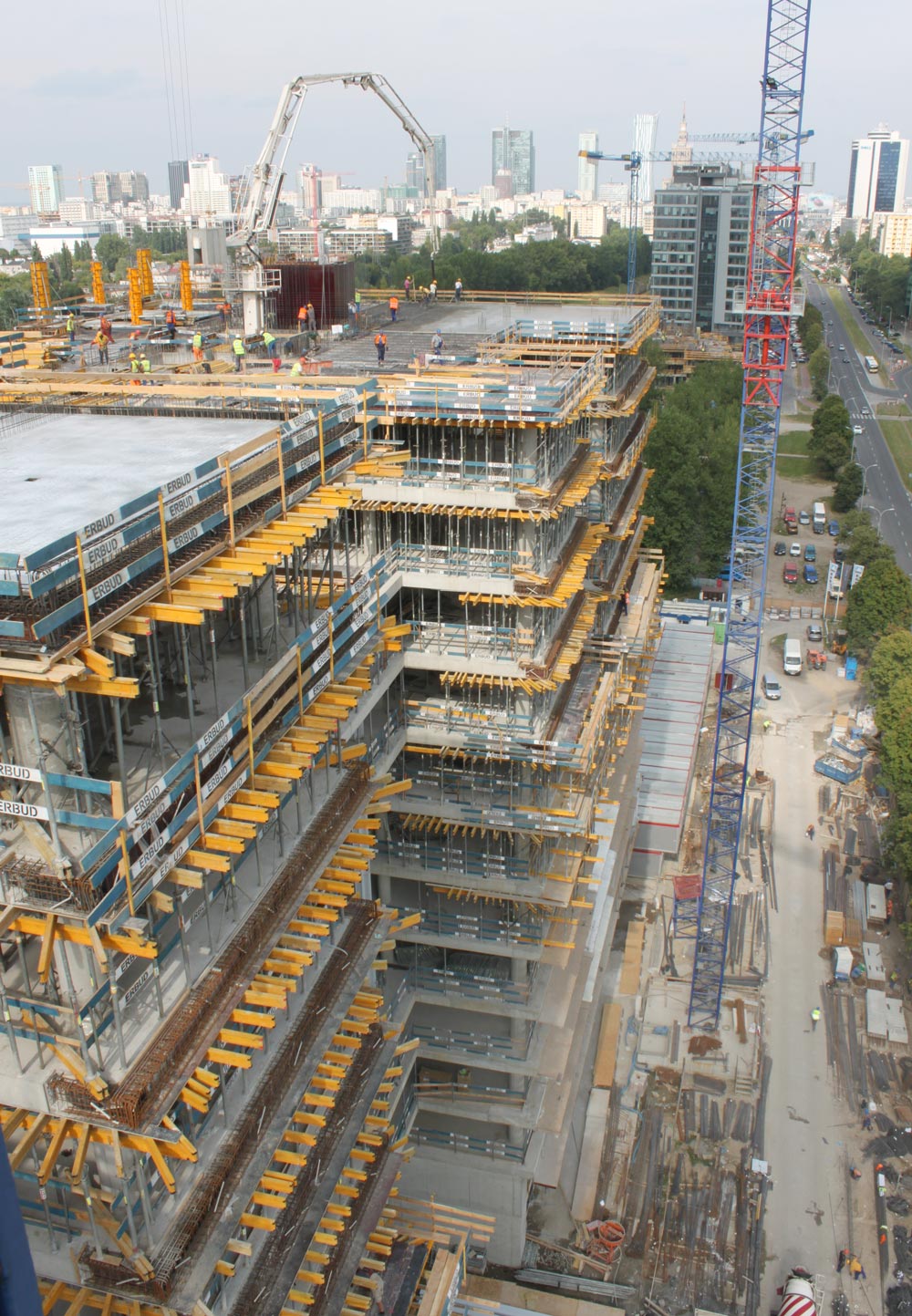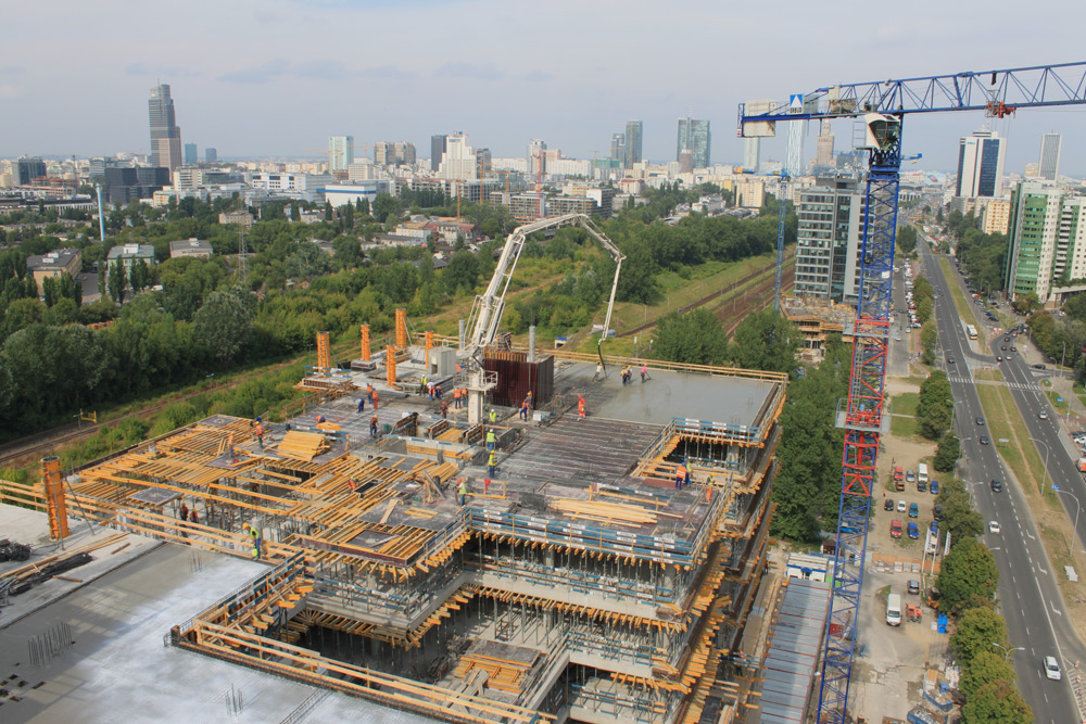 Sloupy byly postaveny s pomocí kovového kruhového bednění. Bednění železobetonových stropů bylo sestaveno ze systému ENKOFLEX, podepřeného stojkami EP. Podpěry T-60 byly použity pro betonáž stropu ve středu výšky budovy.