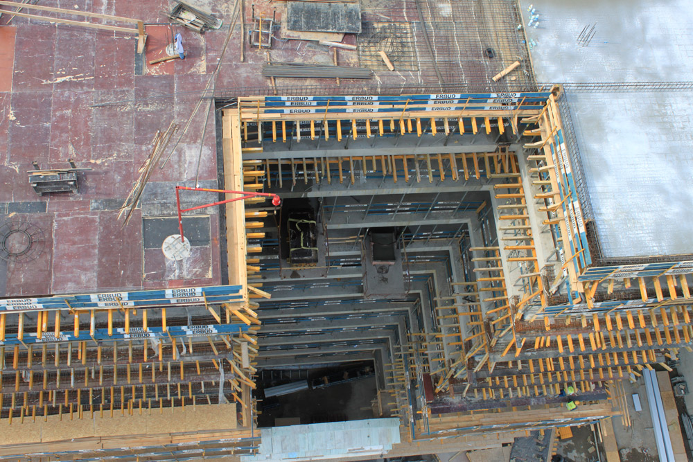 Pro stavbu příčných stěn výtahových šachet bez použití jeřábu byly využity zavěšené plošiny, které byly uchyceny k nosníkům vyššího podlaží. Tato sestava umožnila snadnou montáž a demontáž zavěšeného bednění. Průlezné podlážky ve vyšších plošinách usnadnily instalaci schodišť, která byla vyrobena předem, včetně podest a spojovacích prvků.