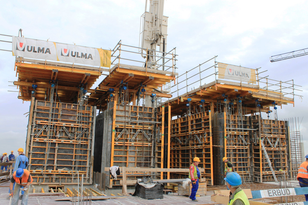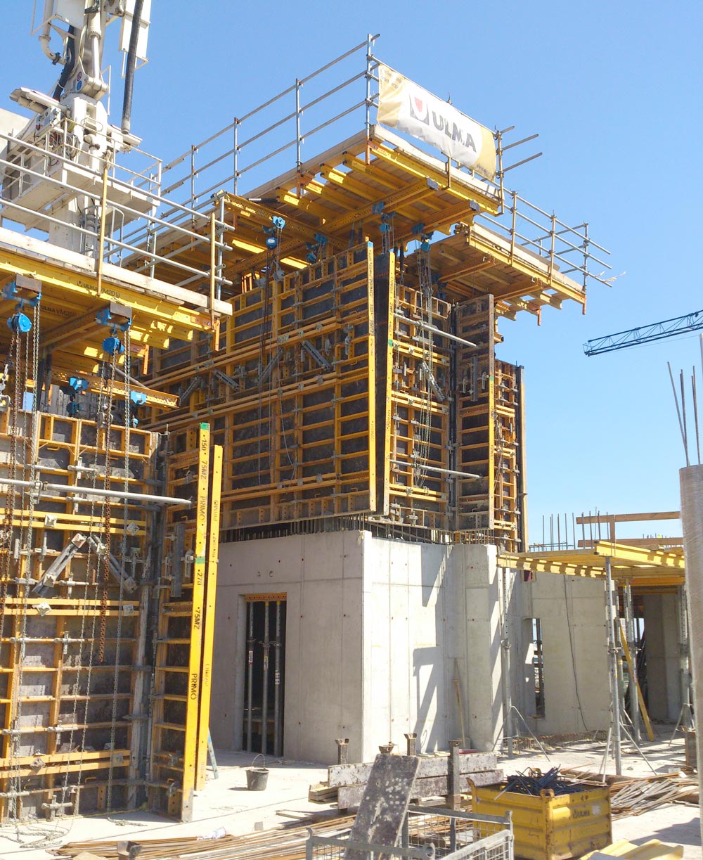 Jádro budovy se dvěma schodišti a výtahovými šachtami bylo postaveno pomocí dvou samošplhacích systémů. Samošplhací konzoly ATR-B byly využity pro stavbu schodišť a plošiny ATR-P pro výtahové šachty. Oba systémy byly sestaveny z prvků MK.