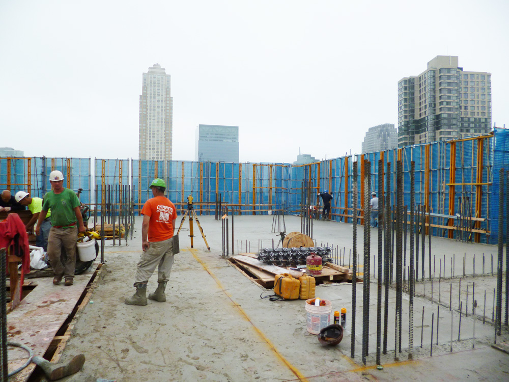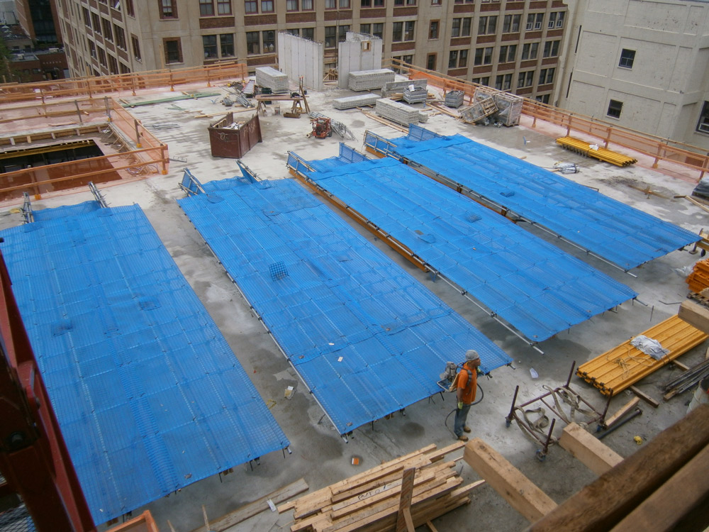 Pro zajištění bezpečného pracoviště jsme plášť budovy zakryli prvky samošplhacího systému HWS. Ten se skládá z panelů, které obepínají rozestavěnou část budovy a tři podlaží pod ní. Systém má vlastní hydraulické zařízení pro posun celé sestavy do výšky.