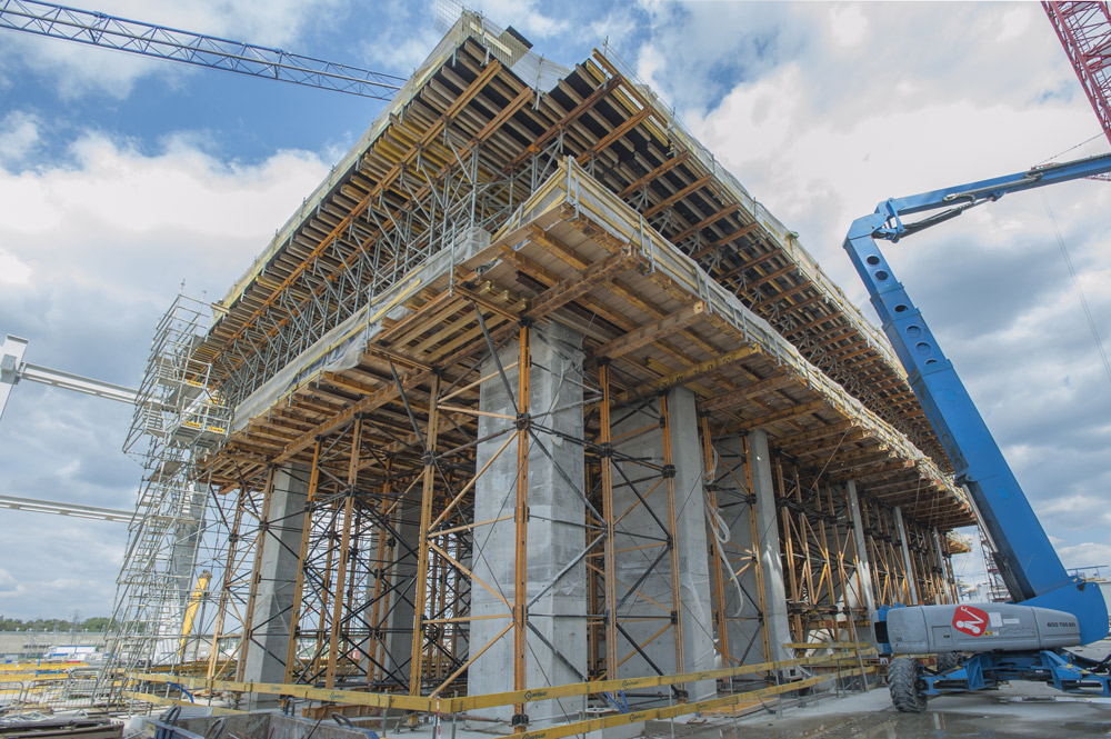 ENKOFLEX a stolové bednění MK byly použity jako bednění pro desky a nosníky. Systém stolového bednění MK obsahuje MK nosníky, které umožňují sklopit a uzamknout ALUPROP stojky, čímž se zjednodušuje a zefektivňuje přesun mezi jednotlivými úrovněmi. Pro desky ve výškách dosahujících až 9,5 m byly použity podpůrné věže T-60.