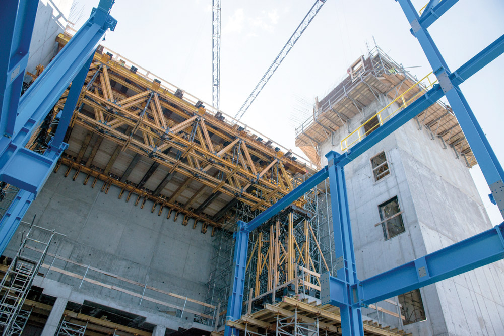 U nejnižší části budovy – stěn vysokých 2,65 m – byly použity jednostranné nosníky SMK a stropní bednění ENKOFORM V-100 o výšce 2,70 m. Mezitím byly pomocí 3,5 m x 4,8 m dlouhých šplhacích konzol budovány vyšší stěny – k tomu bylo využito prvkové bednění ORMA vysoké 5,4 m. Tento systém, který je vysoce efektivní jak z hlediska ceny, tak času, byl následně použit pro stavbu stěn dalších budov.