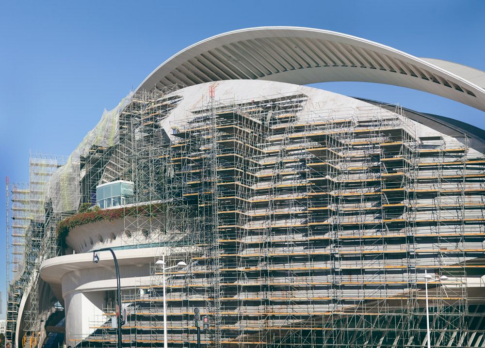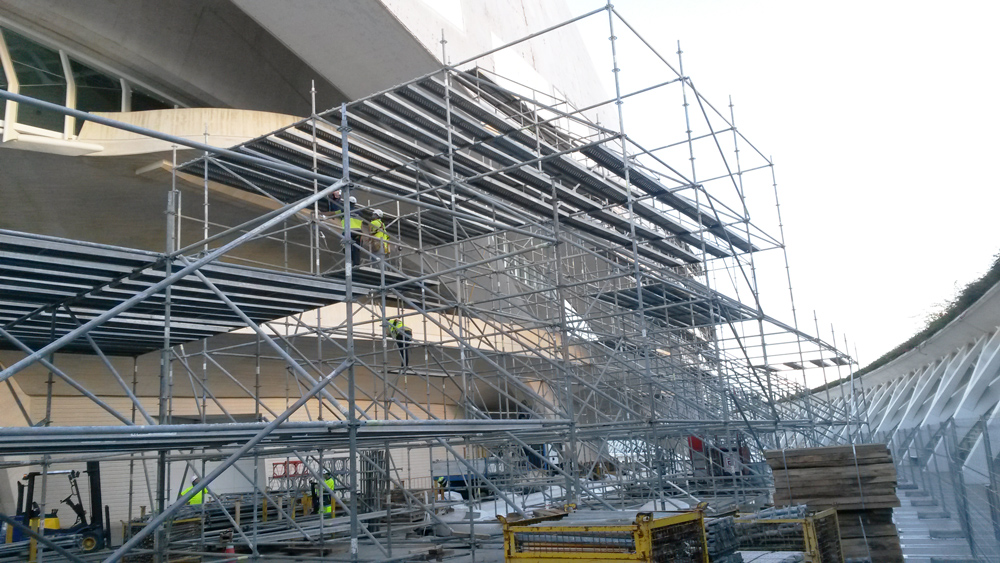 K pokrytí zakřiveného povrchu stavby bylo potřeba dodat celkem 48.000 m³ lešení. Z toho 12.000 m³ pokrývalo v navazujících řadách fasádu. Instalovali jsme pracovní plošiny o šířkách 700 mm, 1.020 mm, 1.500 mm a 2.000 mm, které zaručily naprostou bezpečnost pracovníků a potřebný odstup lešení od samotné stavby. Přístup na plošiny zajistila schodiště zabudovaná do vlastní struktury lešení.