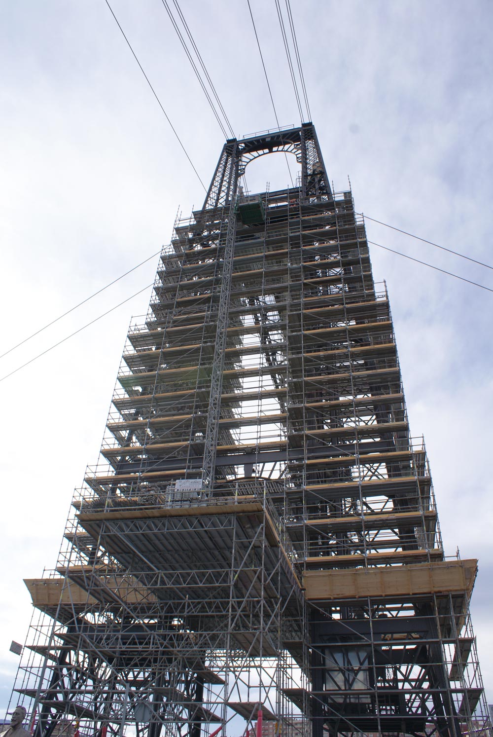 Konstrukce věží byla použita také pro montáž podpěrné plošiny stavebního výtahu. Tato plošina byla vyrobena z plošin umístěných na 5 m dlouhých můstcích ve výšce 7,5 m.
