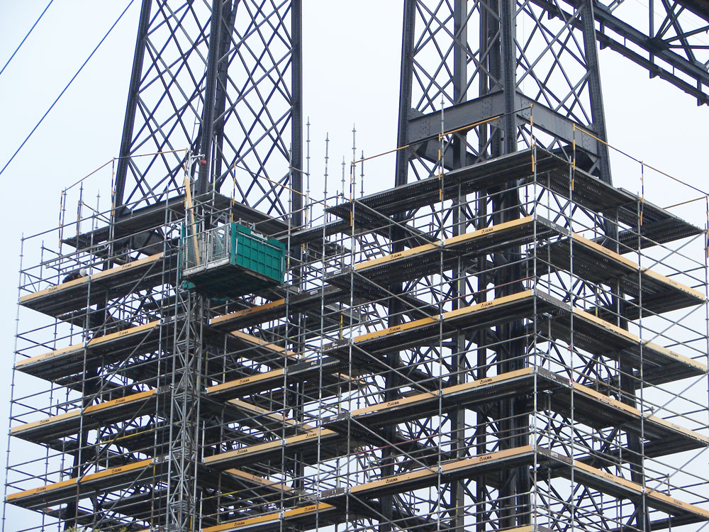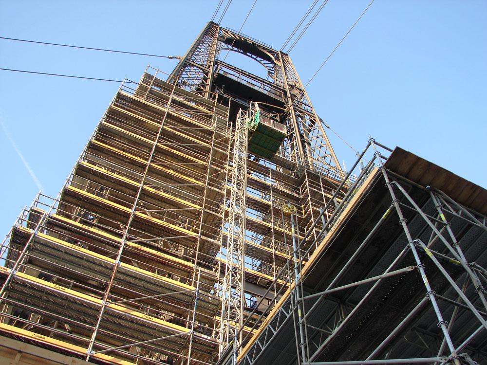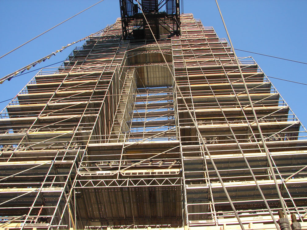 Struktura byla kompletně opláštěna modulovým lešením BRIO. 800 tun materiálu bylo distribuováno na čtyřech 68 m vysokých věžích a vodorovném ocelovém rámu dlouhém 162 m. Lešení podpůrných věží bylo opřeno na zemi, zatímco vodorovná konstrukce byla zavěšena na příhradovém nosníku.