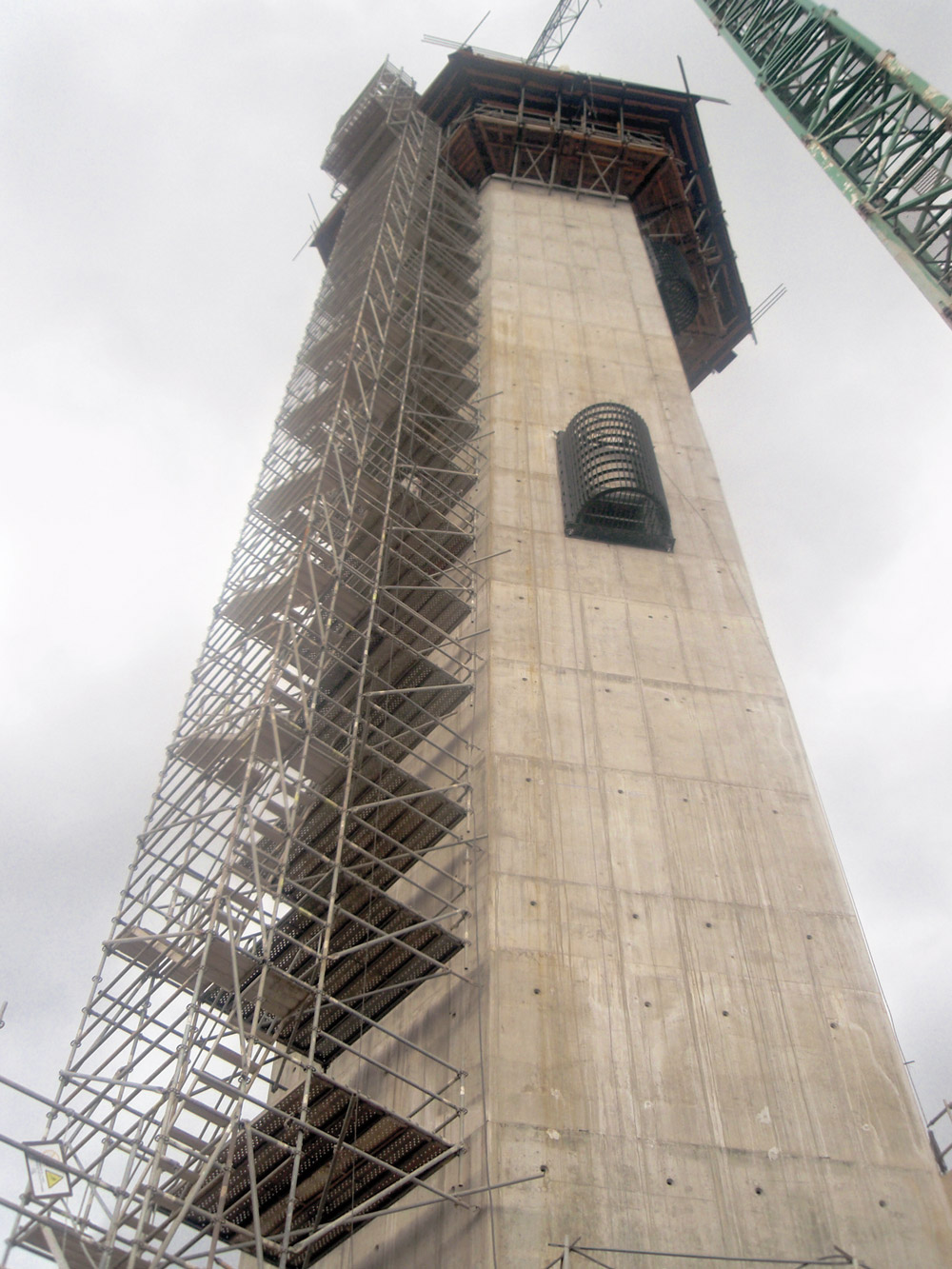 Posledních 10 m výšky stěn věže tvoří válcové struktury o průměru 13,5 m, které se stavěly pomocí našeho systému kruhového bednění.