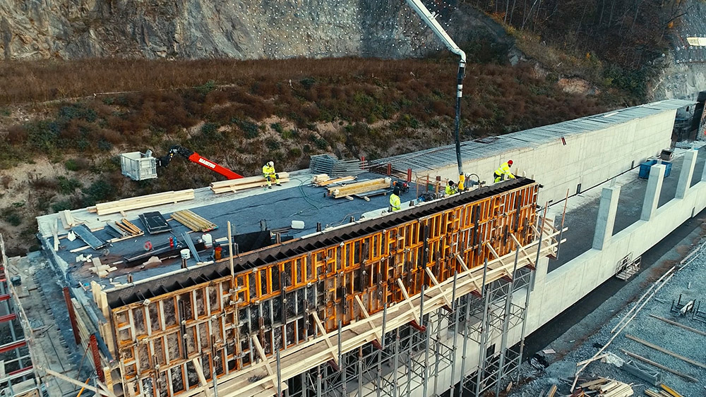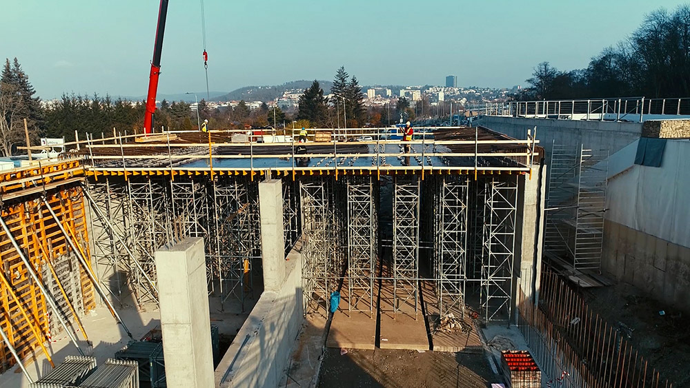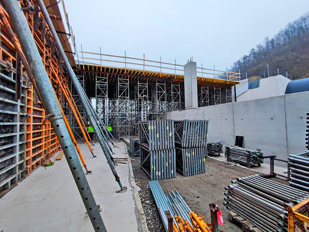 Stěny, pilíře, sloupy byly vytvořeny ze systému ORMA za pomoci jeřábu. Výstupové věže, pomocné plošiny na vázání výztuže až do výšky 8 m byly ze systému BRIO.