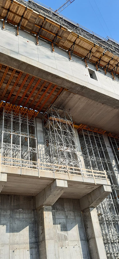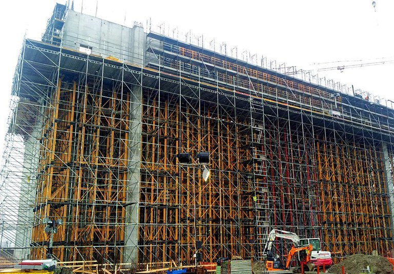 Stěny, které dosáhnou celkové výšky 40 m, spolu s opěrnými pilíři, byly postaveny s pomocí stěnového rámového bednění ORMA osazeného na šplhavých konzolách BMK zakotvených do betonu, který již byl odlit.