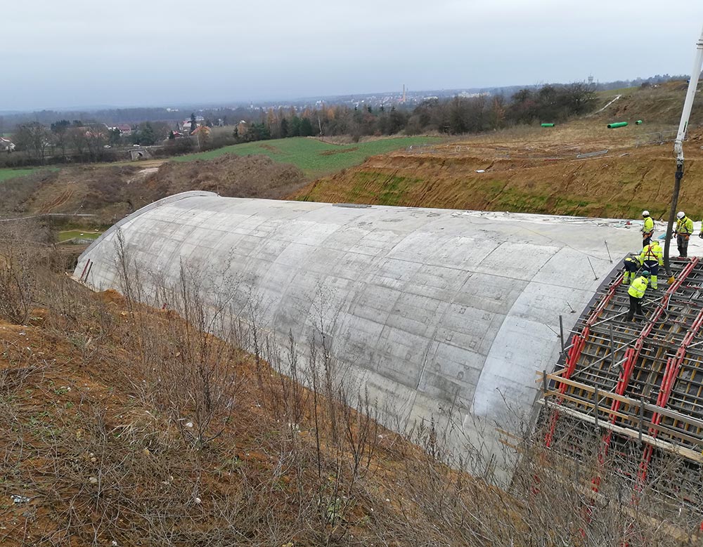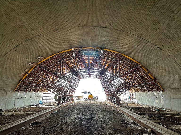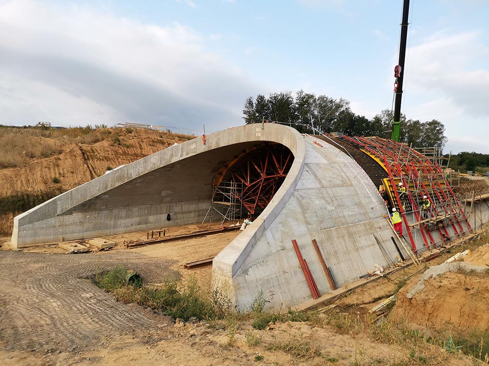 Nosná konstrukce byla řešena jako posuvná skruž v podobě tunelového vozíku. Formu oblouku, která byla navržena ze systémů MECCANO + OMEGA, sestavil zákazník na stavbě.